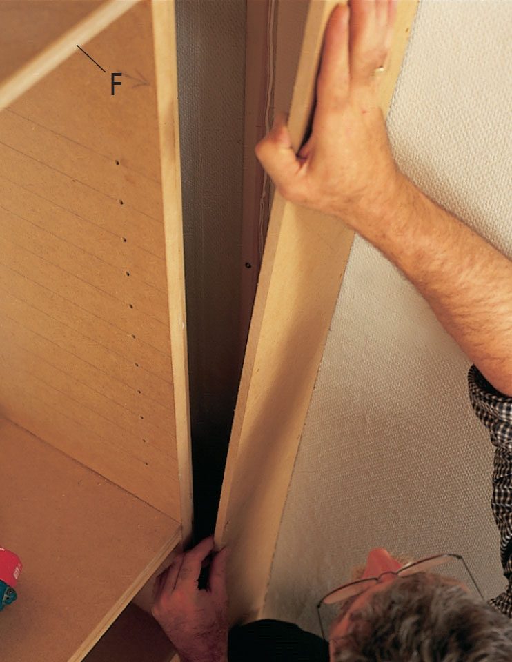 Reol og skabsmodul er nu samlet, og samlinger i inddækning og skruer spartlet med woodfiller. Bemærk, hvordan den gennemgående liste (F), som er fastgjort i forkanten af den faste hylde (C), udgør bunden i reolen.