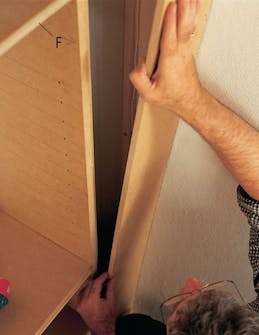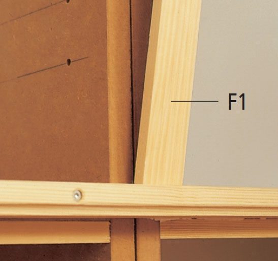 Inddækningen tilpasses og fastgøres til listerne med lim og stifter. Ved sammen-stødning af inddækning lægges et stykke plade (en laske) bag samlingen. Den gennemgående frontliste (F) er fremstillet af 21 x 43 mm høvlet fyrretræ. Den øverste kant er faset let, mens den nederste er profileret med et hulkeljern i en overfræser - denne bruges også til fræsning af lågerne.