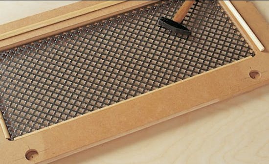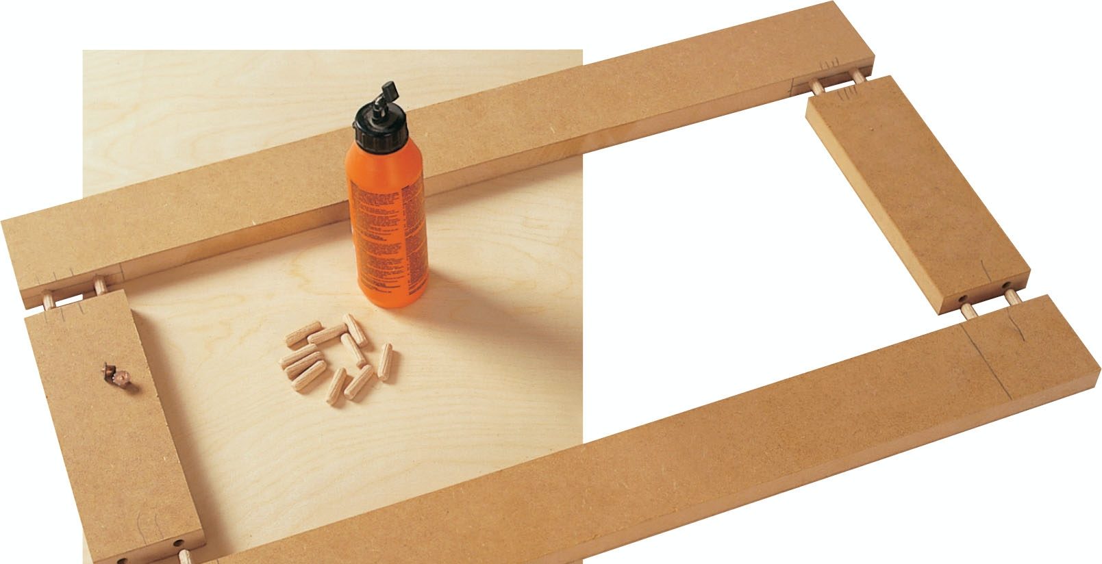 Lågerne er fremstillet af 22 mm mdf-plade, som er savet ud i stykker (P + Q) på 8 centimeter. Disse samles til rammer med lim og to 8 x 30 mm dyvler i hvert hjørne (se mål på tegning).