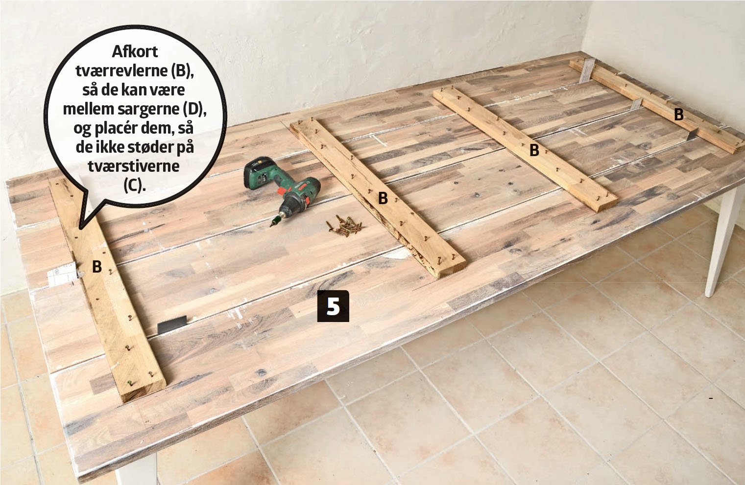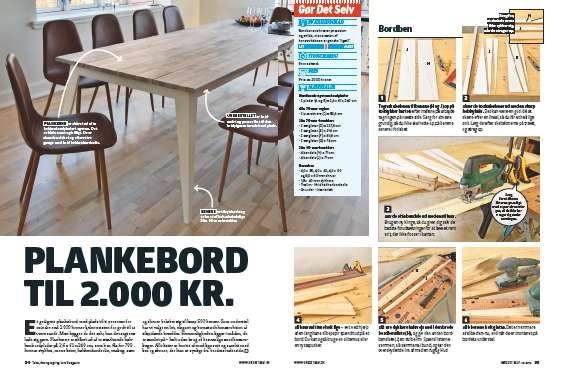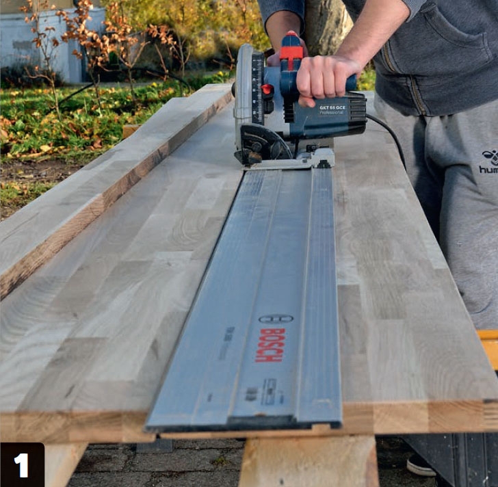 Arbejdet med bordpladerne er egentlig det nemmeste i processen. Det vigtigste er, at du er omhyggelig, når du skærer plankerne ud. Har du ikke en bordrundsav eller en dyksav med føringsskinne, kan du få byggemarkedets savværk til at tage sig af udskæringen.