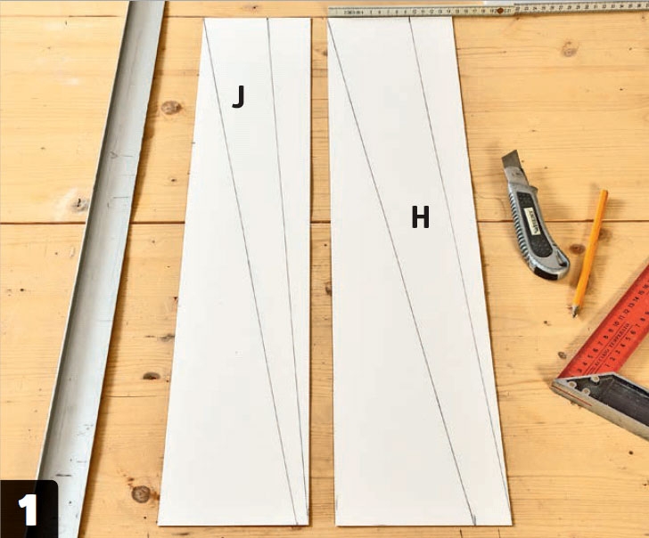 Tegn skabelonen til benene (H og J) op på to stykker karton efter målene på arbejdstegningen. Sørg for at være grundig, så du ikke skal rette op på benene senere i forløbet.