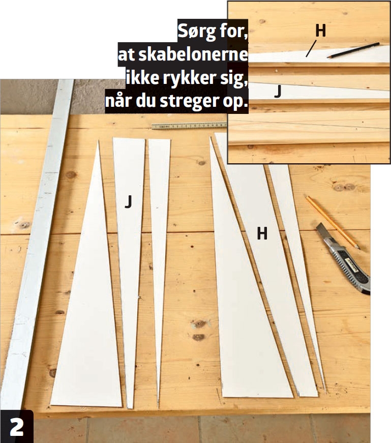 Skær de to skabeloner ud med en skarp hobbykniv. Det kan være en god idé at skære efter en lineal, så du får et helt lige snit. Læg derefter skabelonerne på træet, og streg op.