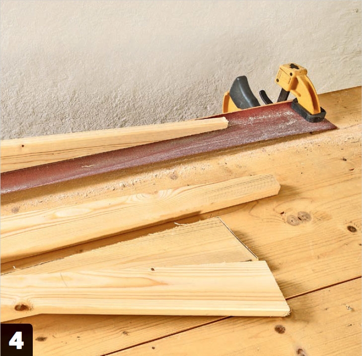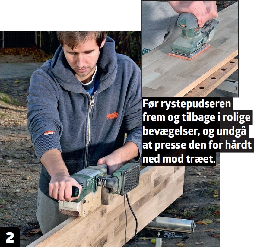 Slib savsnittene helt glatte og lige med en båndsliber. Fladerne slibes efterfølgende med en rystepudser eller en excentersliber, først med korn 120 og til sidst med korn 180.