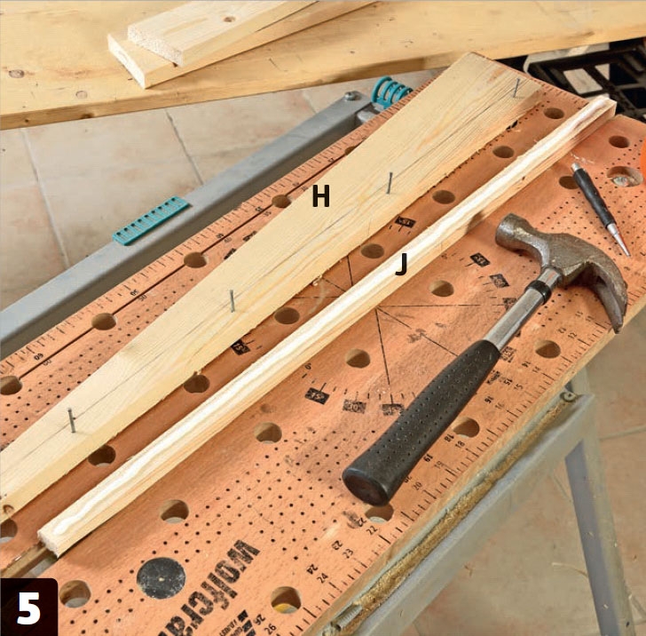 Slå fire dykkere halvvejs ned i den brede bordbensliste (H), og giv den anden bord-bensliste (J) en stribe lim. Spænd listerne sammen, slå sømmene i bund, og tør den overskydende lim af med en fugtig klud.