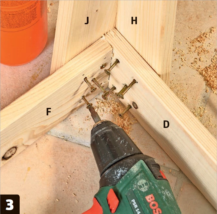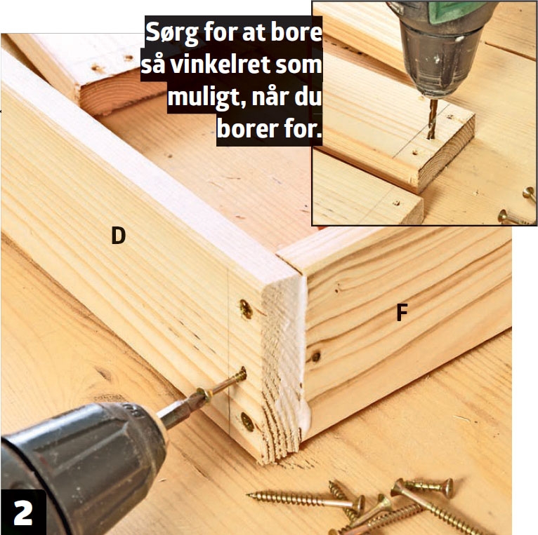Bor for til samling af sarglisterne med et 4-mm-bor, og saml derefter rammen med lim og tre 4,0 x 50 mm-skruer pr. samling.