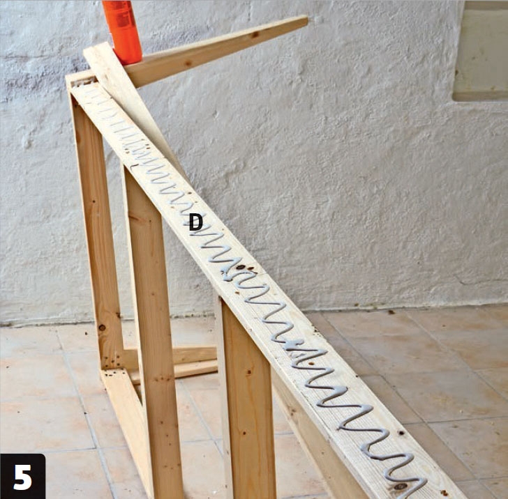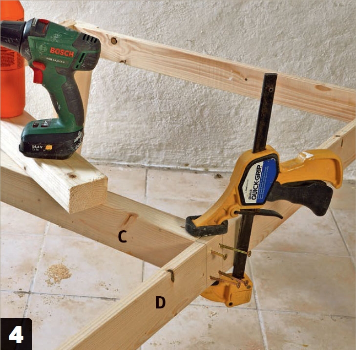 Tilpas de to tværstivere (C), og montér dem med lim og 5,0 x 60 mm skruer mellem de to lange sargstykker (D).