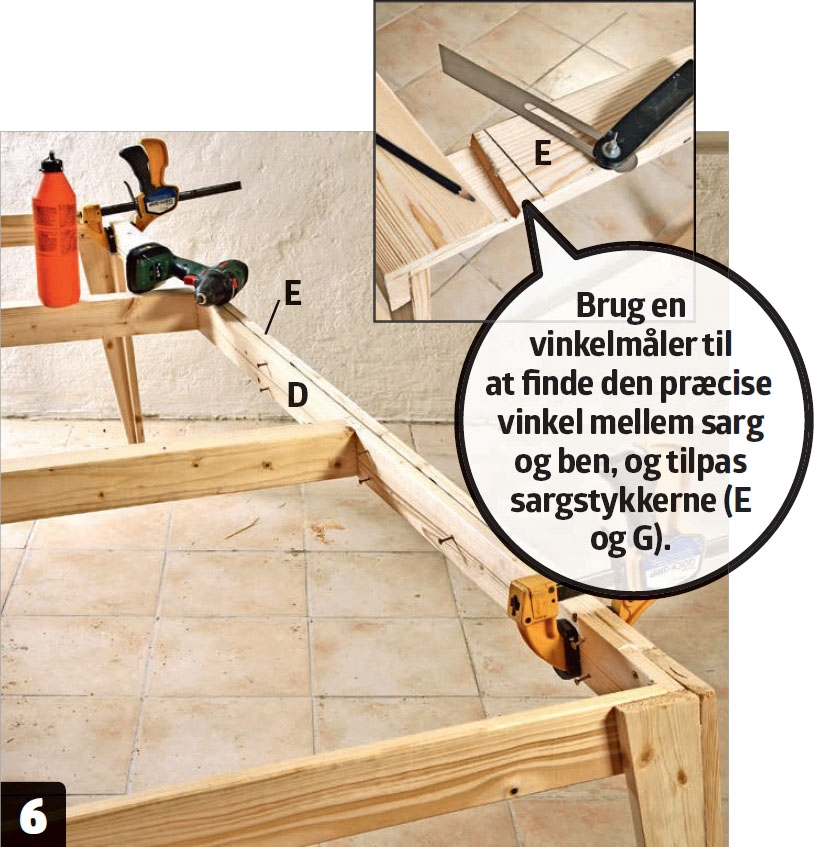 Snittet på sarglisterne (D og F) skal være 8 mm ude af vinkel, så de passer med bordbenene (H og J). Indstil vinklen på kapsaven, og kort de fire lister af efter målene i materialelisten.