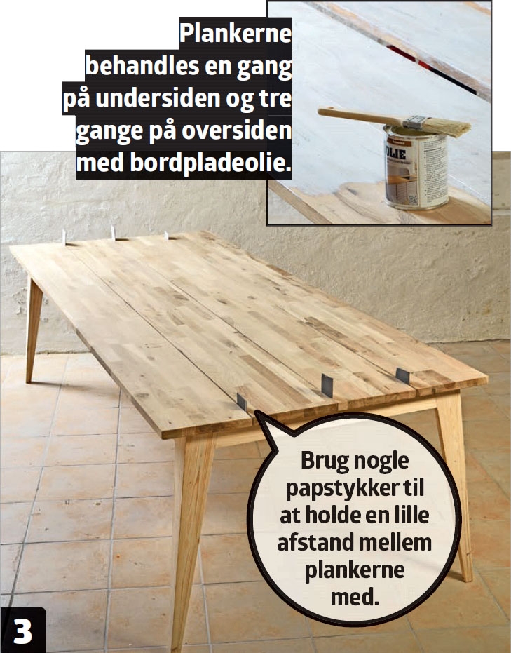 Bredden af bordet afhænger af, hvor stort mellemrum du ønsker mellem plankerne. Vi bruger papstykker som afstandsklodser og sigter efter et mellemrum på 5 mm.