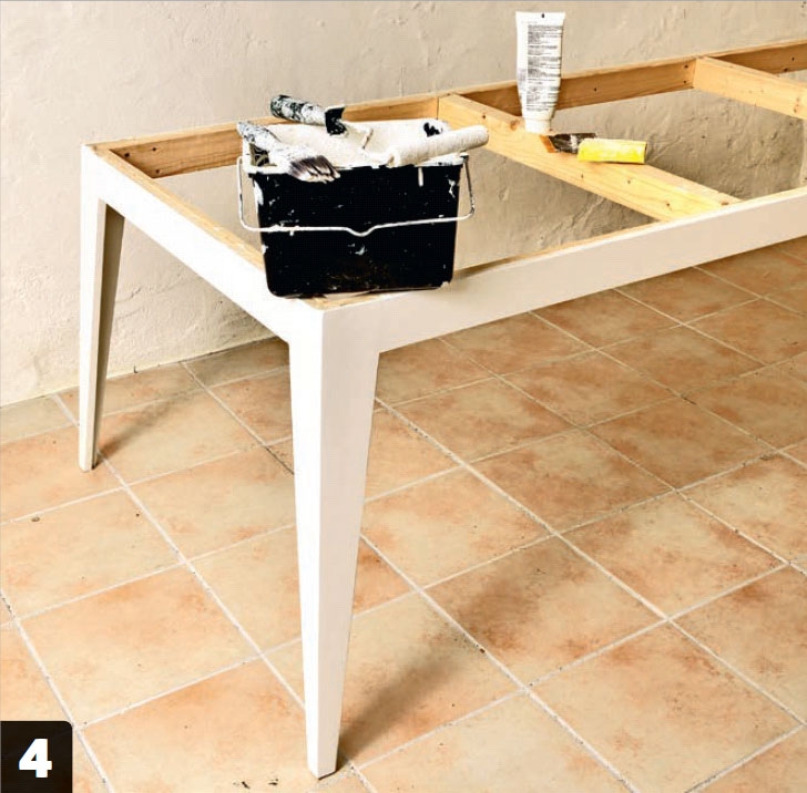 Bor for i sarglisterne, smør efterfølgende godt med lim på sargen, og skru benene fast med 4,0 x 35 mm skruer.