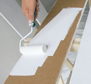Du gør også skabsbyggeriet meget lettere, hvis du på forhånd rullemaler pladerne med grunder og to gange halvblank hvid akrylmaling (fx glans 40).