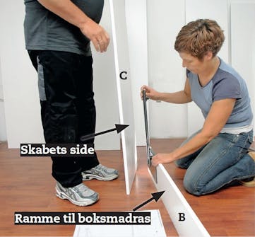 Nu er det en fordel at være to om opgaven. Først skal I beklæde boksmadrassen med en udvendig ramme af mdf-plader. De to vippebeslag monteres på de langsgående sideplader (B), helt ude i enderne ved de tværgående mdf-plader (A).