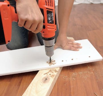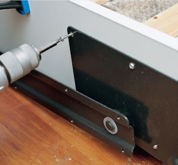 Skru mdf-pladen fast med universalskruer 5,0 x 25 mm i hver af de to udtrækkelige benbeslag. Mål 8 cm ned fra madrassens underkant, så du kan skrue mdf-pladen fast i madrassens bundramme.