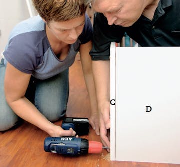 Skru skabets front (E) (fodsparket) fast, så den er trukket 5 cm tilbage fra forkanten. Bor for med et 5 mm bor, og saml med møbelsamleskruer M 6,3 x 80 mm - sæt to skruer i hver side.