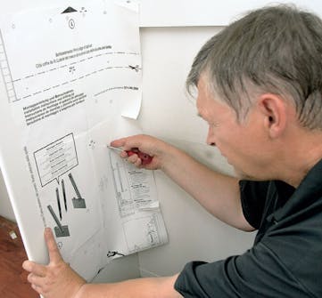Ryk skabet ind på plads. Kontroller med et vaterpas, at skabet står lodret. Marker skabets placering på væggen, så du kan sætte plugs i væggen, afhængigt af hvad væggen er lavet af.