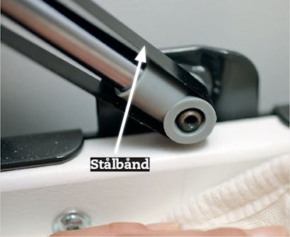 Sæt den medfølgende skrue i gasstøddæmperen. Stram skruen godt, så dæmperen ikke kan komme på afveje, når stålbåndet løsnes om lidt.