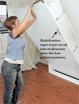 Den flotteste skabsløsning får du, hvis du også beklæder skabssengens forside (sengebunden) med mdf-plader. Det har vi gjort. Alternativt kan du montere forhæng eller låger.