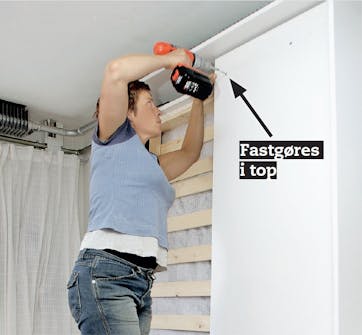 Skru mdf-pladerne fast i top, bund og sider med spunskruer, 5,0 x 60 mm. Bor for og undersænk skruerne. Pladernes længde er tilpasset, så de går fri af fodsparket, når sengen vippes op og ned.