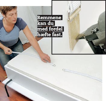 Clips tre elastiske remme fast til sengen. De skal holde sengetøjet på plads, når sengen vippes til lodret. Remmene monteres på sidebeklædningen med små strimler læder.