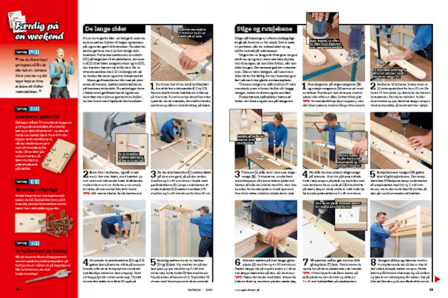 Du bygger først sengens to gavle, dem samler du med de lange sidebrædder, og så til sidst tilføjer du lamelbunden, bordene, stigen og rutsjebanen.