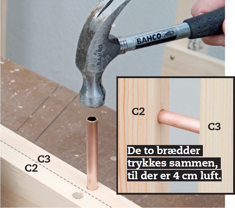Du borer hul til de små kobberrør i fire af de fem sidebrædder (C2 og C3). Rørene skal forbinde brædderne midtvejs på hver side. For at bore lige langt fra enden spænder du de brædder, der skal forbindes, sammen og slår en vinkelret streg på tværs.