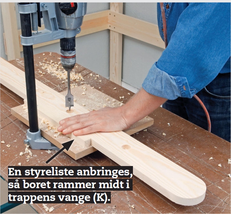 Hullerne til trinene bores med et 25 mm spadebor for hver 25 cm. De bores 15 mm dybe, og det styrer du med en borestander. Den styrer dybden, holder boret lodret og gør det let at lægge vangen mod en styreliste, så boret rammer rigtigt.
