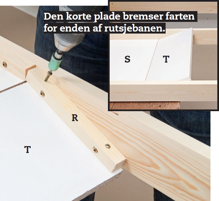 Rutsjebanens vanger (N) gøres klar til glidepladerne. Den lange bæreliste (P) fastgøres langs underkanten af rutsjebrættet med lim og 5 x 40 mm skruer, mens den korte liste (R) vinkles, så den går op til overkanten af brættet.
