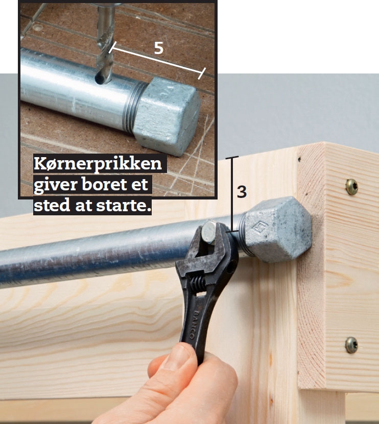 Så skal røret (J) op. Du begynder med at skrue en endemuffe på i begge ender af røret. Mål 5 cm ind fra enderne, slå en kørnerprik, og bor 8,5 mm huller i prikkerne. Røret fastgøres med 8 x 80 mm franske skruer 3 cm fra toppen.