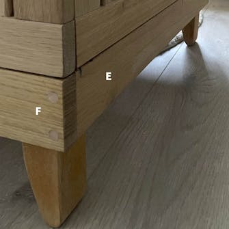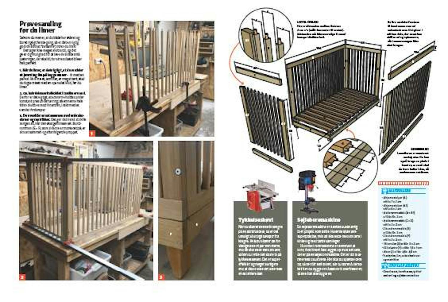 Bor huller i sengens ramme (B, C, E og F), så balustrene kan fæstnes med dyvler. Lim dyvlerne fast til hver enkelt baluster (H), inden du monterer dem på rammen.