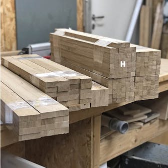 De små firkantede stave (H) bliver til balustre, som du kan skære af bund- og overstykker. De øvrige dele skal danne ramme og bund, og de skal skæres af karmens lange sidestykker.