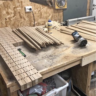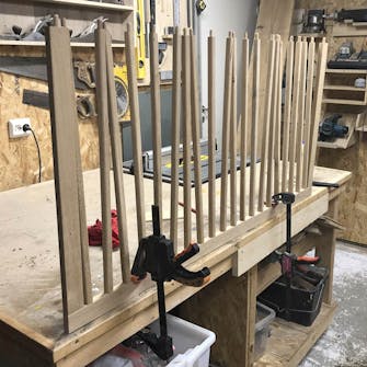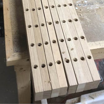 Hullerne til dyvlerne skal være meget præcise, og det gør du nemmest ved at bore dem med en søjleboremaskine. Det er en god idé at runde kanterne på balustrene, inden de monteres. Her kan du fx bruge en kantfræser, som er helt perfekt til lige præcis det, men du kan også sagtens bruge en almindelig overfræser eller en skarp høvl.