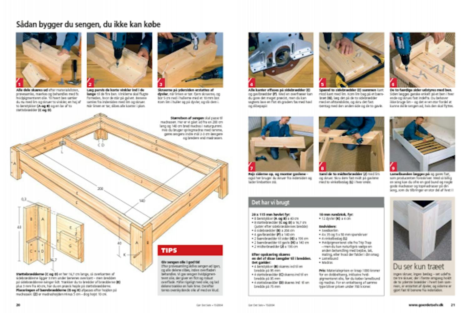 Materialeprisen er knap 1000 kroner for en dobbeltseng, inklusive hvidpigmenteret olie, før du køber lamelbund og madras. For en enkeltseng af samme type bliver prisen under 700 kroner.