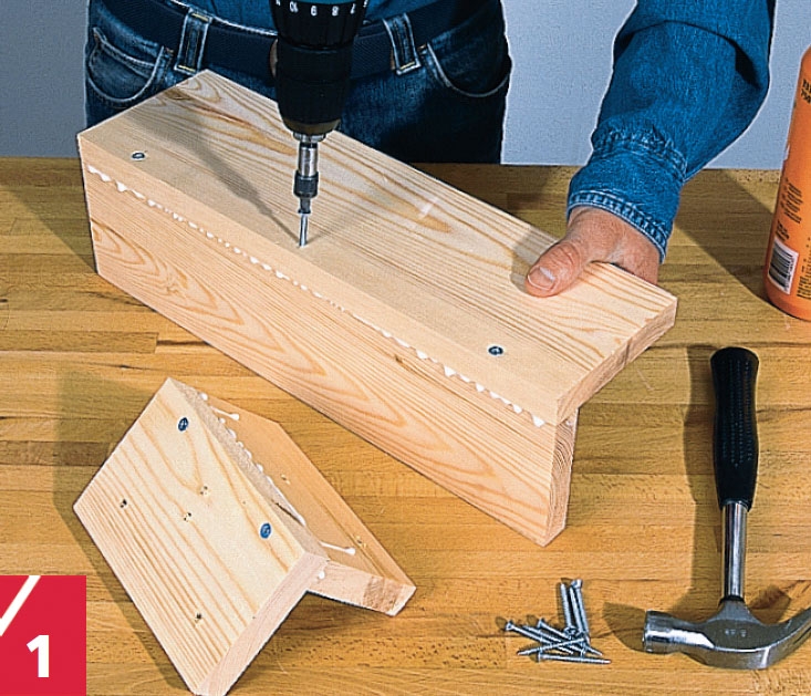 Spænd to sidebrædder (E) sammen kant mod kant med lim. Kom lim bag på et bære-bræt (G), læg det på de to sidebrædder med en afstandsliste, og skru det fast. Gentag med den anden side og de to gavle.