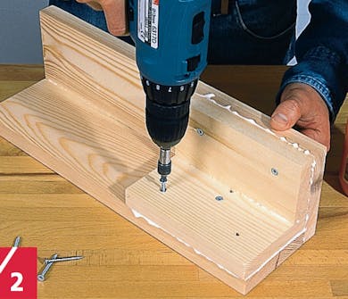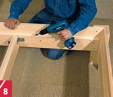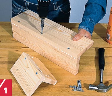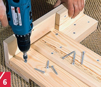 Læg parvis de korte vinkler ind i de lange til de fire ben. Vinklerne skal flugte forneden, hvor de står på gulvet. Benene samles fra indersiden med lim og skruer. Når limen er tør, slibes alle kanter i plan.