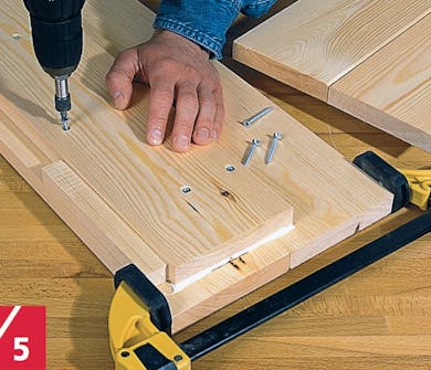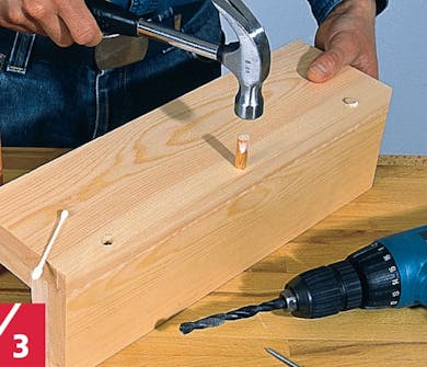 Skruerne på ydersiden erstattes af dyvler, når limen er tør. Fjern skruerne, og bor 5 cm ned i hullerne med et 10 mm bor. Kom lim i huller og på dyvler, og slå dem i.