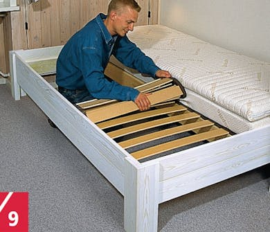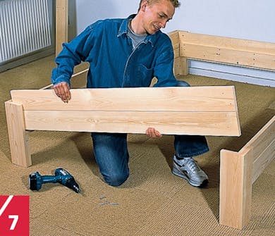 De to færdige sider udstyres med ben. Siden lægges ganske enkelt på et ben i hver ende og skrues fast indefra. Du behøver ikke bruge lim - og det er en stor fordel at kunne skille sengen ad, hvis den skal flyttes.