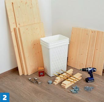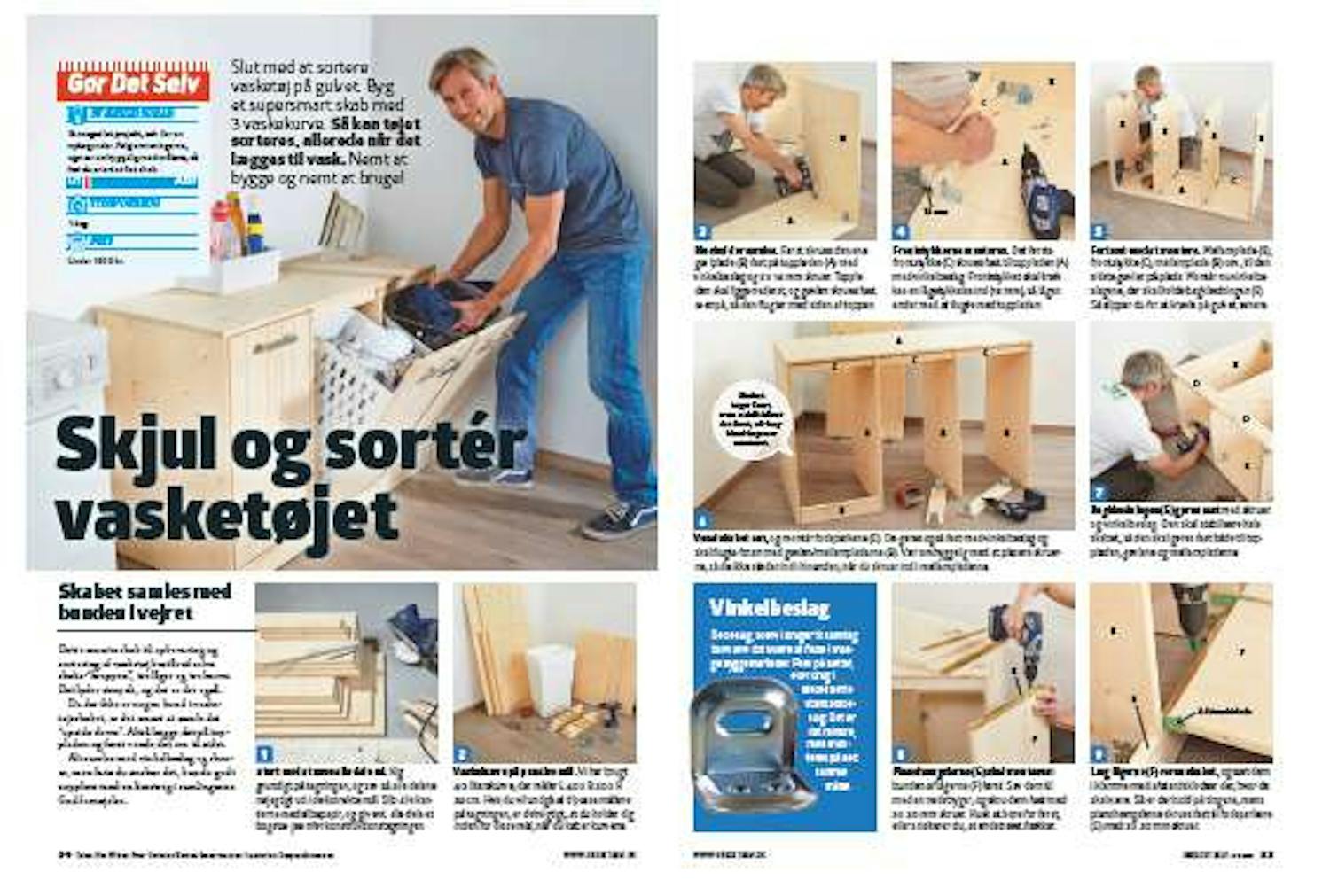 Vaskekurve på præcise mål. Vi har brugt 40-literskurve, der måler L 40 x B 30 x H 52 cm. Hvis du vil undgå at tilpasse målene på tegningen, er det vigtigt, at du holder dig inden for disse mål, når du køber kurvene.