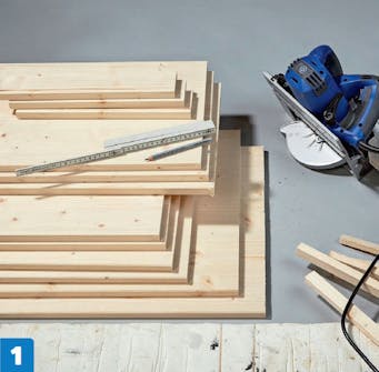 Start med at save alle dele ud. Kig grundigt på tegningen, og sav så alle delene nøjagtigt ud i de korrekte mål. Slib alle kanterne med slibepapir, og giv evt. alle dele et bogstav jævnfør konstruktionstegningen.