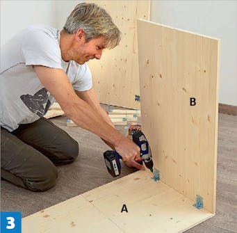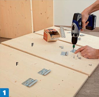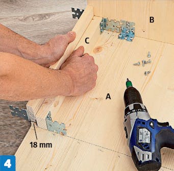 Nu skal der samles. Først skrues den ene gavlplade (B) fast på toppladen (A) med vinkelbeslag og 5 x 16 mm skruer. Toppladen skal ligge nederst, og gavlen skrues fast ovenpå, så den flugter med siden af toppen.