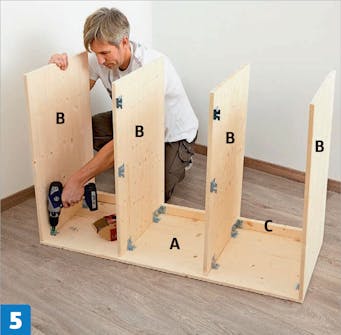 Vend skabet om, og montér fodsparkene (D). De gøres også fast med vinkelbeslag og skal flugte foran med gavlen/mellempladerne (B). Vær omhyggelig med at placere skruerne, så de ikke støder ind i hinanden, når du skruer ind i mellempladerne.