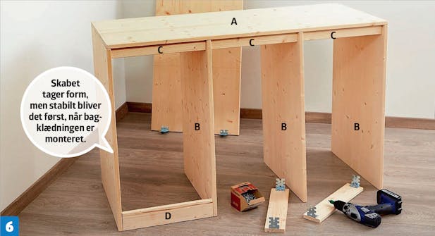 Bagklædningen (E) gøres fast med skruer og vinkelbeslag. Den skal stabilisere hele skabet, så den skal gøres fast både til toppladen, gavlene og mellempladerne.