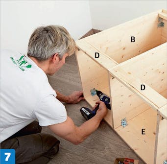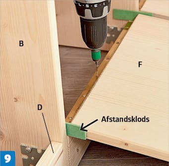 Fortsæt med at montere. Mellemplade (B), frontstykke (C), mellemplade (B) osv., til den sidste gavl er på plads. Montér nu vinkelbeslagene, der skal holde bagklædningen (E). Så slipper du for at kravle på gulvet senere.