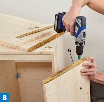 Pianohængslerne (G) skal monteres i bunden af lågerne (F) først. Sav dem til med en nedstryger, og skru dem fast med 3 x 30 mm skruer. Husk at bore for først, ellers risikerer du, at endetræet flækker.
