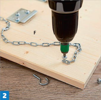 Sikkerhedskæden kortes af. Mål op, hvor lang kæden skal være (plus 10 cm til at gribe fat i). Fastgør en krog inde i skabet, og lad den vende lidt bagud, så kæden ikke hopper af, når lågen åbnes.