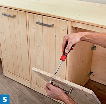 Til sidst monteres håndtagene. Mål nøjagtigt op, hvor håndtagene sidder bedst, og bor så huller igennem lågerne. Håndtagene gøres fast med skruer fra bagsiden. Skruerne kan evt. sikres med en klat lim.