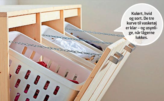 I stedet for et traditionelt skab med låger, der hængsles i siderne, og vasketøjskurvene stående på en hylde eller på gulvet har vi valgt at hængsle lågerne i bunden. Og så hænger vi kurvene op på indersiden af lågerne, så de følger med ud, når lågerne åbnes.