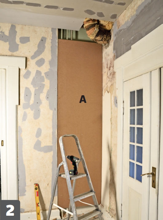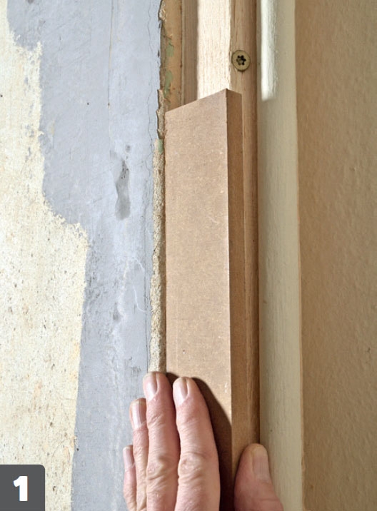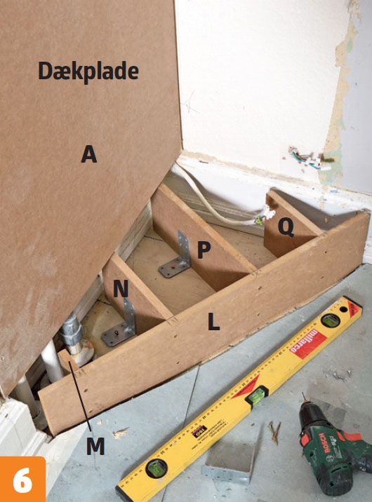 Find den rette tykkelse. Indhakket skjules med en dækplade af 12 mm MDF. Pladen skrues på lister på væggene.