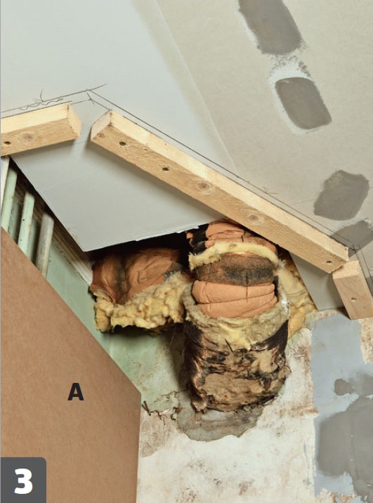 Skabet skal dække rør og faldstamme efter en renovering. Der er tale om en 100 procent skræddersyet løsning. Her giver det bedst mening at starte med at montere toppen af skabet, som det færdige skab gøres fast til. Toppen skrues fast i loftet.
