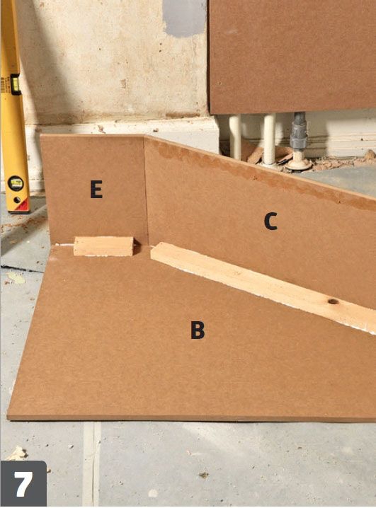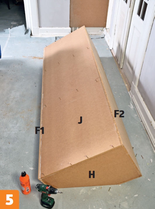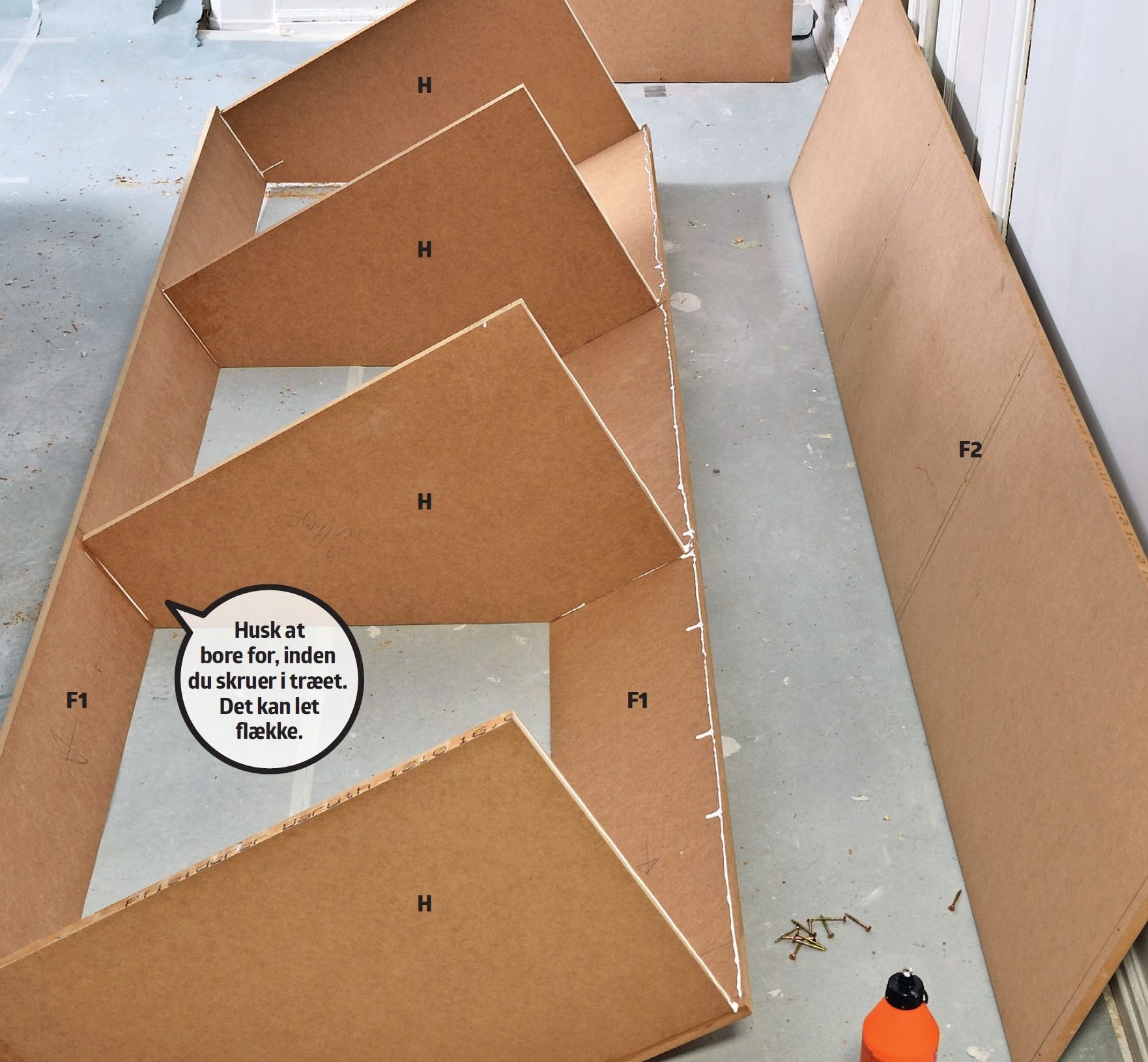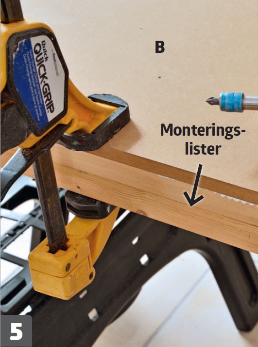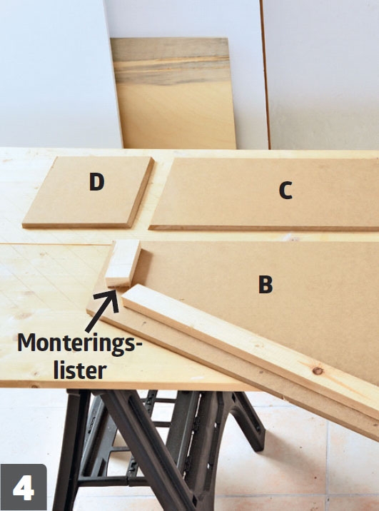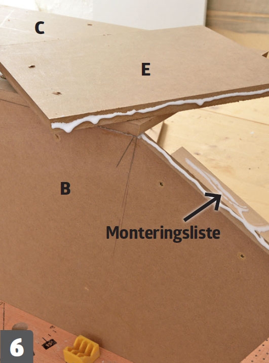 Sidestykkerne (C, D, E) skrues fast. Smør godt med lim på siderne, og skru dem fast til monteringslisterne.