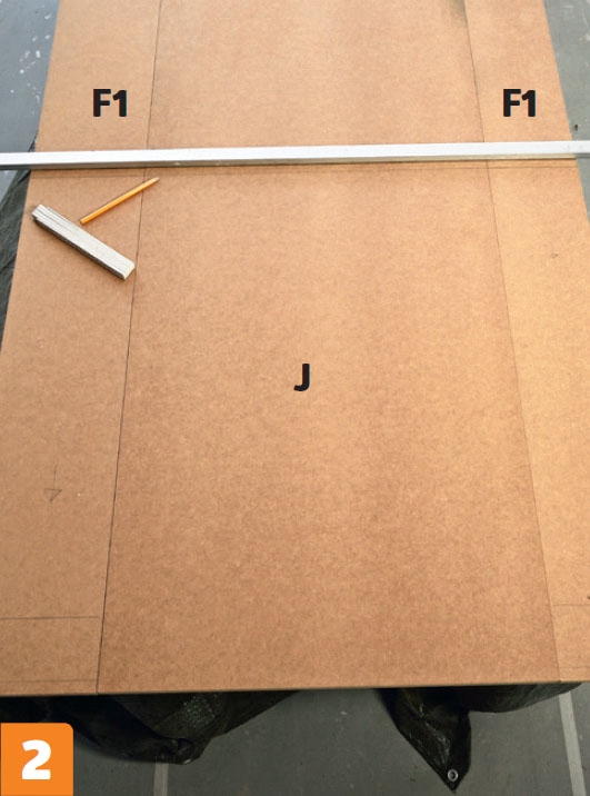 Bunden (B) skæres til. Tegn bunden af “kassen” op på et stykke MDF-plade. Pas derefter de tre sider D, C og E til, så de kan skrues på bunden.