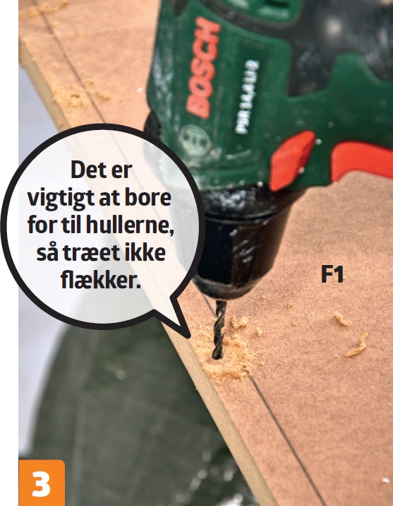 Siderne (F1) bores for. Der bores for til skruehuller i siderne med et 4 mm bor, så bagbeklædningen kan skrues på.